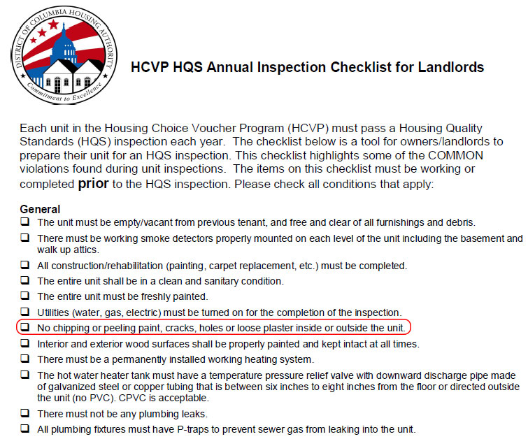 The U.S. Department of Housing and Urban Development (HUD) requires landlords receiving housing assistance payments get an annual inspection for their rental properties. DCHA schedules the inspection and notifies each landlord of the date and time of the inspection. Landlords receive an inspection checklist of all issues found during the inspection. The checklist states the location of the hazard and includes the specific lead-based paint hazard, loose/peeling paint, in the comments. Lead hazards must be addressed by trained workers using work safe practices.